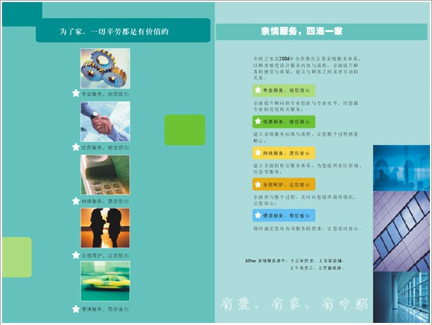 中联地铺的传播,将以“家体验”为纽带,给顾客带来“中联之家” 的 5Star 服务。“家体验”包括从服务/业务品牌、地铺环境、服务特色、经纪人素质、公司网站、企业内刊、各类POP以及活动策划等等,将全方位、立体式地为中联人、中联客户打造 “中联之家”。