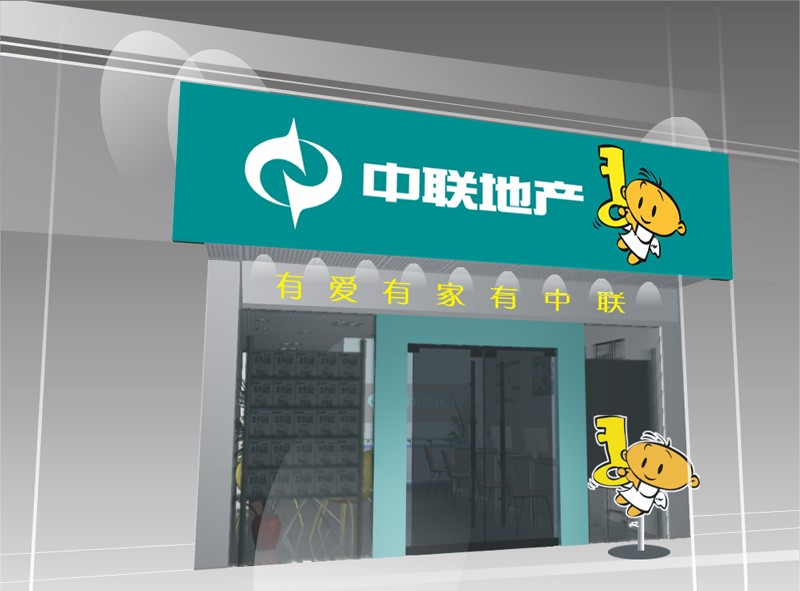 门头和整体店面形象是最为吸引眼球和诱惑灵魂的,同时,由于门头形象起着“画龙点睛”的作用,必须进行统一。目前中联的地铺当中,新旧LOGO都在使用,LOGO的样式不一致,而招牌上的内容也不尽相同。因此,经过精心设计,对门头的规格、字体都进行了统一(如下图),而且在颜色上,采用了绿底白字,区别于大部分中介的红、黄、白三色,并加上了卡通人物,强化对消费者的第一印象。