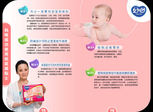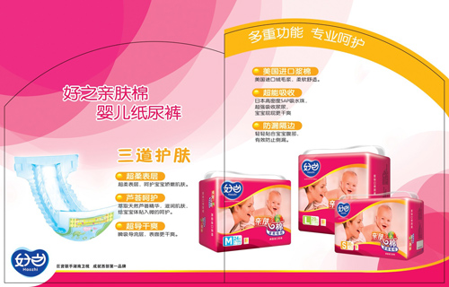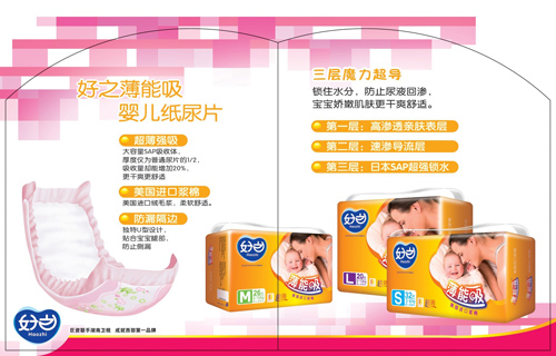 (2)四大系列:根据产品的特性和消费者的需求,好之品牌系统规划了三大幼儿系列产品品牌以及成人系列: 婴儿纸尿裤:好之亲肤棉、好之薄能吸、好之超能吸、好之成人纸尿裤、好之成人纸尿片、好之成人护理垫。完善了产品结构。