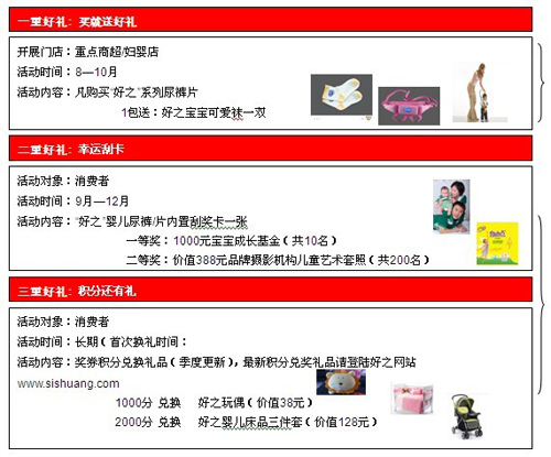 (1)为了促进产品在终端市场的动销,展开了三重好礼贺新生的促销活动: