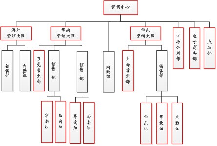 在营销中心下面,按照区域进行业务部门的设立,成立华南营销大区、华东营销大区、海外营销大区,并在各营销大区下设销售部,销售部再按照客户类型和更小范围的区域进行划分。各业务部门在自己所属的区域内进行客户的开发和维护,将客户开发和维护下沉至更小的区域市场。随着区域市场的发展,营销大区下设的销售部能够实现分离,实现营销大区的快速复制。