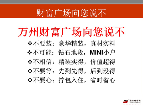 在第一轮强销阶段,配合MINI户型产品的推出,深度挖掘产品特性,推出“不要装、不可能、不相信、不要等、不要心”系列“财富广场向您说不”广告,打破常规,牢牢抓住消费者眼球,开展“逆向思维”广告宣传攻势,在前期媒体宣传的基础上,增加“开盘活动(事件营销)、DM单面派发、社区海报张贴”等动作营销,把视觉与行动紧密联合起来,把宣传势头推向一波高潮。