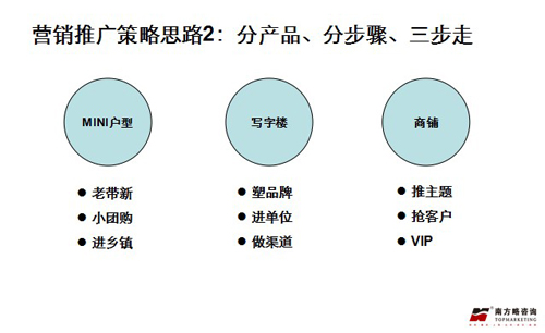 营销策略:根据开盘销售情况和推盘节奏,结合房交会重要销售节点,工作重点调整为:以导入商业市场形象为主,深化写字楼品牌、保持MNI户型惯性销售为辅的思路。