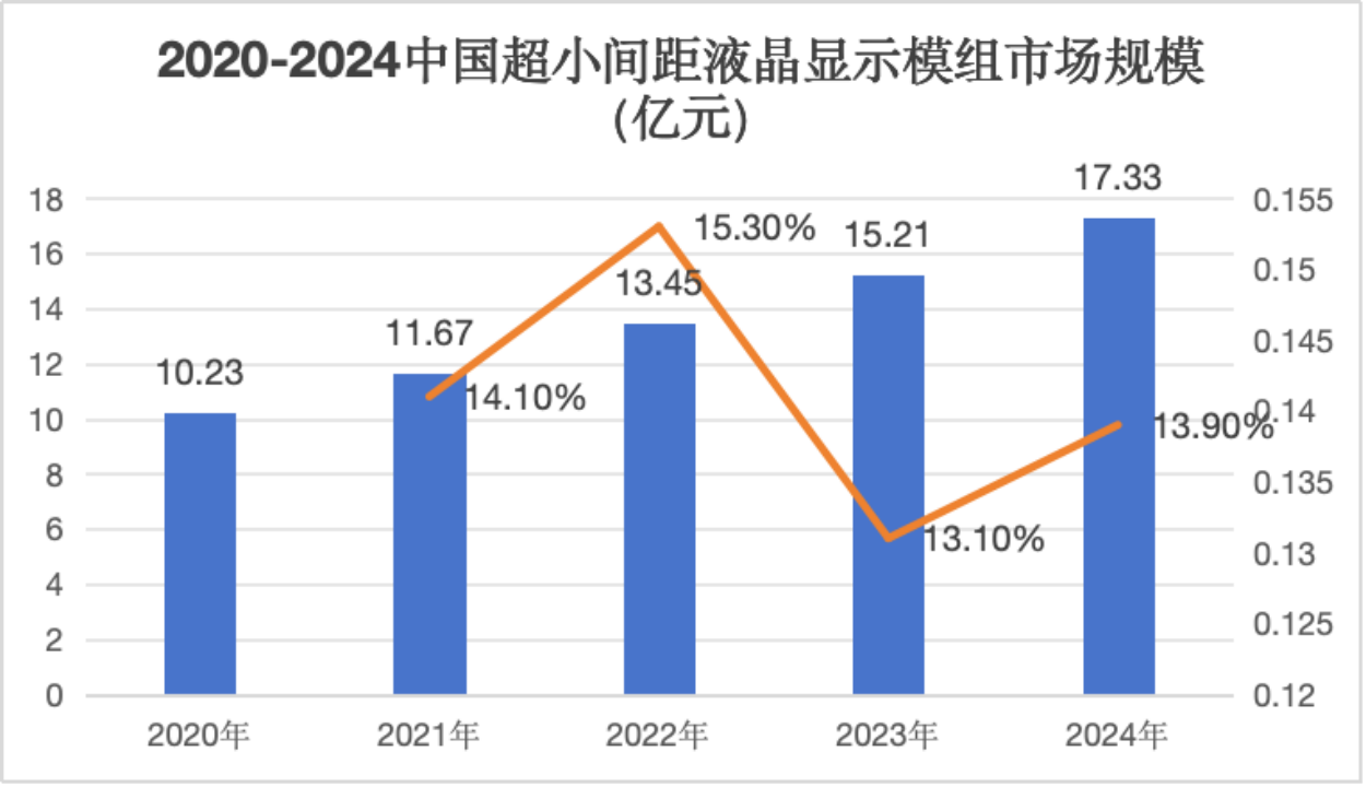 最新数据显示,中国超小间距液晶显示模组(LCD Module)市场规模已从2020年的10.23亿元增长至2024年的17.33亿元,五年间年复合增长率(CAGR)达14.1%,展现出强劲的发展韧性。其中,点间距0.5mm的超高精度模组作为技术标杆产品,市场份额一直稳定在20%左右,主要应用于医疗影像、工业检测等对显示细腻度要求严苛的领域。