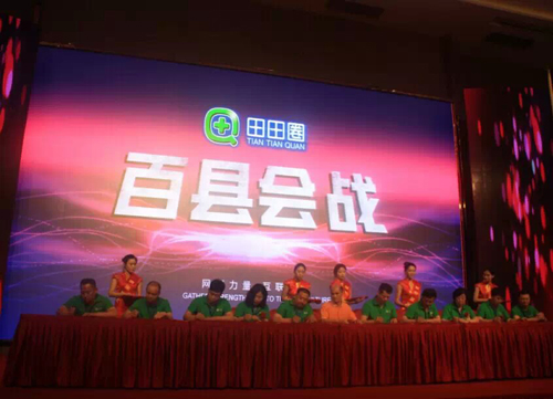 从4月份开始,田田圈百县大战正式开枪以来。在山东栖霞、湖南岳阳、江苏丰县、河南焦作,田田圈的先锋县一个个挂牌成立了。农资店不像农资店,更像一个高级农民会谈中心。农民新鲜啊,一个个都围过来了,电视台来了,政府领导也过来了,隔壁农资店老王也来了,婚庆公司也来凑热闹。