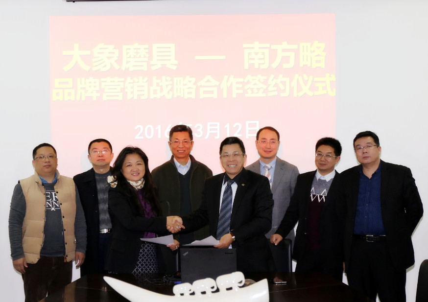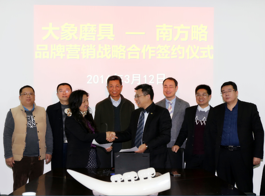 中品会主席王汉武、南方略董事长刘祖轲与大象磨具董事长邹艳玲签约合影